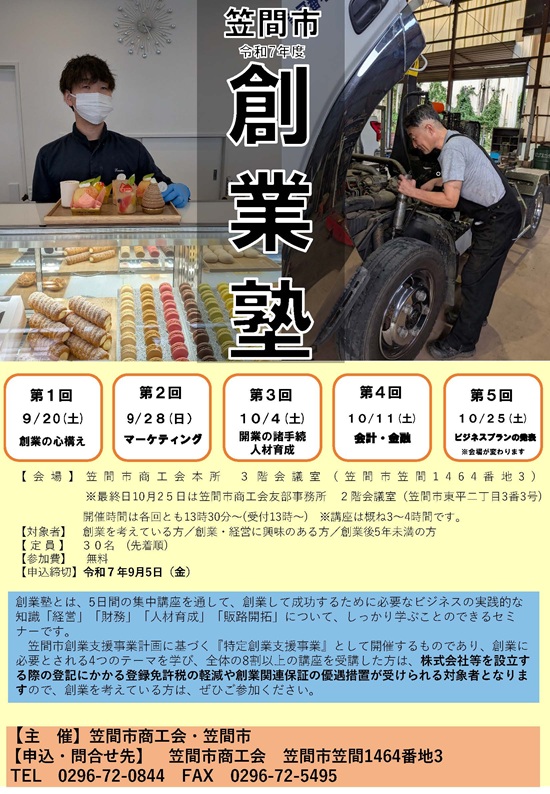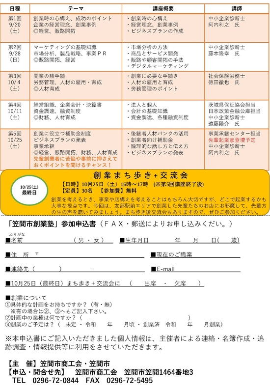 笠間市創業塾は、創業に役立つ知識等が習得すること、受講後も創業に対するサポートをおこなうこと等を目的とした商工会による取り組み。全5日間のプログラムで、創業して成功するために必要なビジネスの実践的な知識「経営」「財務」「人材育成」「販路開拓」についてしっかり学ぶことのできるセミナーとなっています。